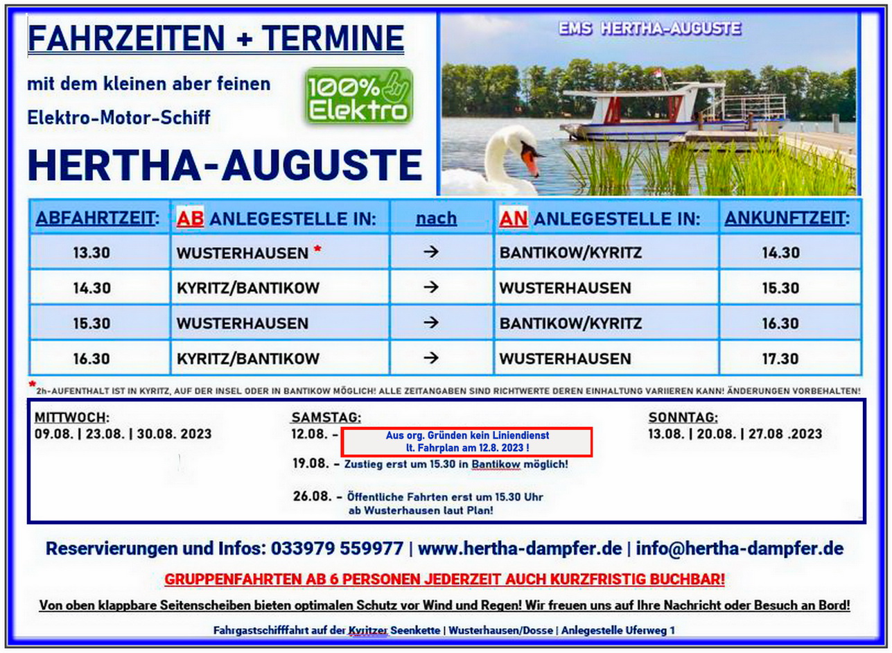 8 Aug. 2023 FAHRPLAN + FAHRTAGE für AUGUST mit HERTHA-AUGUSTE online! von mschimpke | Veröffentlicht in: AKTUELLE MELDUNGEN | 0 FAHRPLAN FÜR FAHRGASTSCHIFF HERTHA AUGUSTE NACH KYRITZ, BANTIKOW UND WUSTERHAUSEN ENDLICH ONLINE! und zum → → PDF-DOWNLOAD ← ← weitersagen über Klick, um auf Facebook zu teilen (Wird in neuem Fenster geöffnet) Facebook Klicke, um auf X zu teilen (Wird in neuem Fenster geöffnet) X Klicken, um auf WhatsApp zu teilen (Wird in neuem Fenster geöffnet) WhatsApp Klick, um auf LinkedIn zu teilen (Wird in neuem Fenster geöffnet) LinkedIn Klick, um auf Pinterest zu teilen (Wird in neuem Fenster geöffnet) Pinterest Klicken, um einem Freund einen Link per E-Mail zu senden (Wird in neuem Fenster geöffnet) E-Mail
