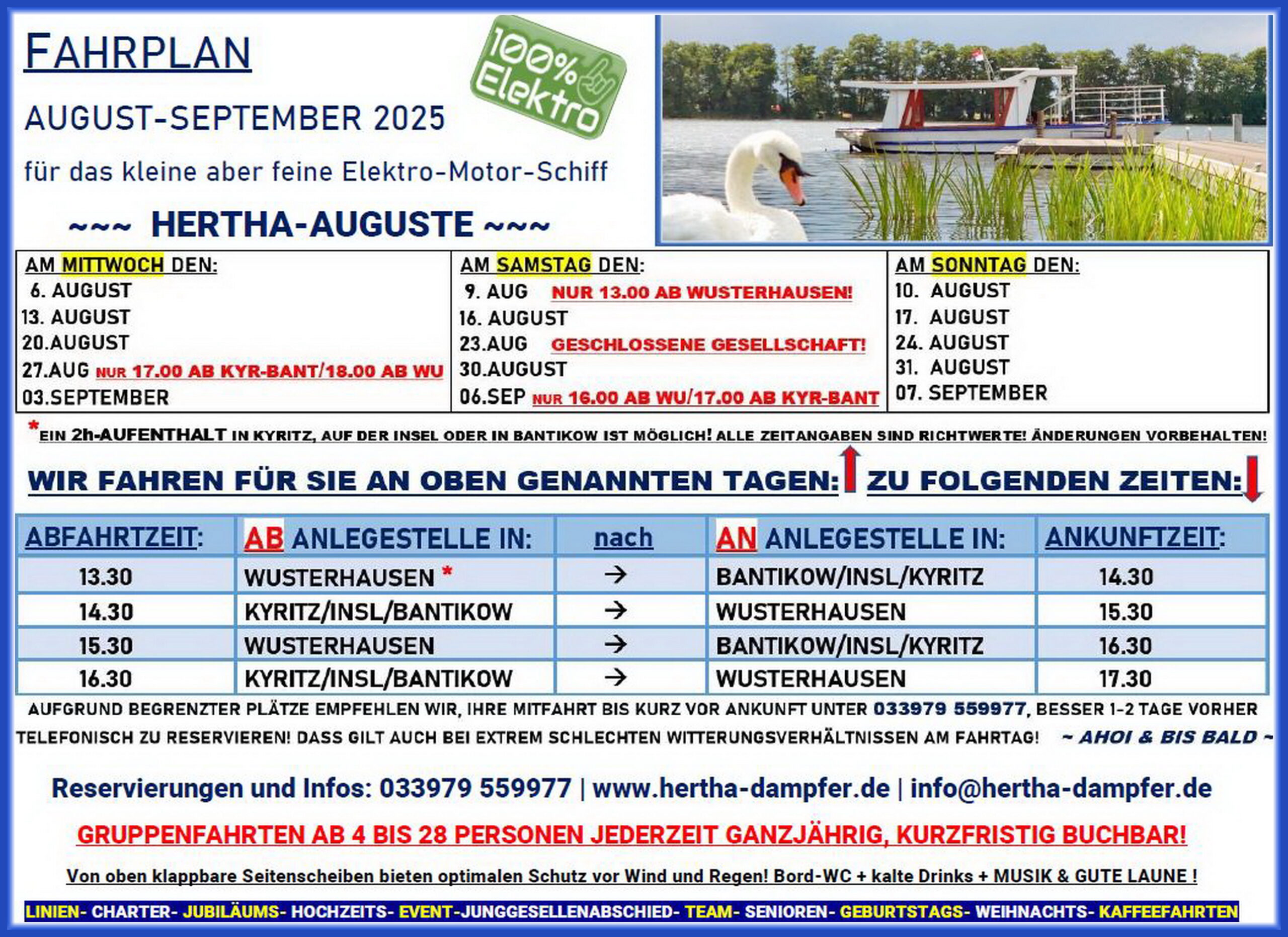 Fahrplan August 2025 - Fahrgastschifffahrt Wusterhausen/Dosse - Kyritzer Seenkette- Bootstour mit Elektro-Motorschiff HERTHA-AUGUSTE