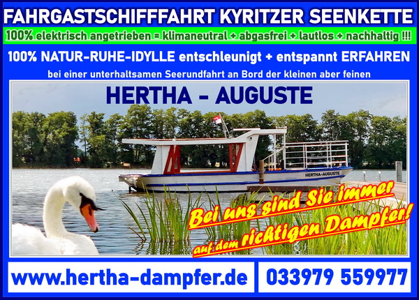 Entspannung und Erholung mit dem HERTHA AUGUSTE DAMPFER dem Folgeschiff des Hertha BSC Gruendungsschiff der ALTEN DAME oder HERTHA Dampfer auf der Kyritzer Seenkette! Ruhe, Idylle, Erholung und Natur pur geniessen an Bord des kleinen und feinen Fahrgastschiff Hertha-Auguste, mit klimaneutralem E-Antrieb entschleunigen sie im Naturparadies!