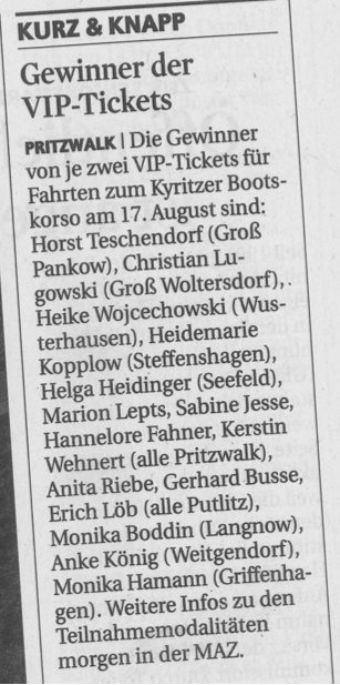 MAZ verlost VIP-Fahrten zum Kyritzer Bootskorso ab Putlitz und Pritzwalk